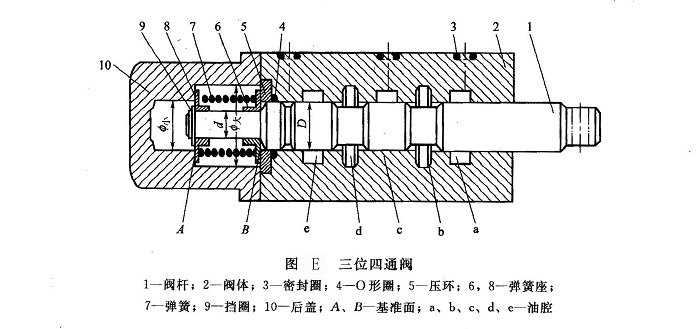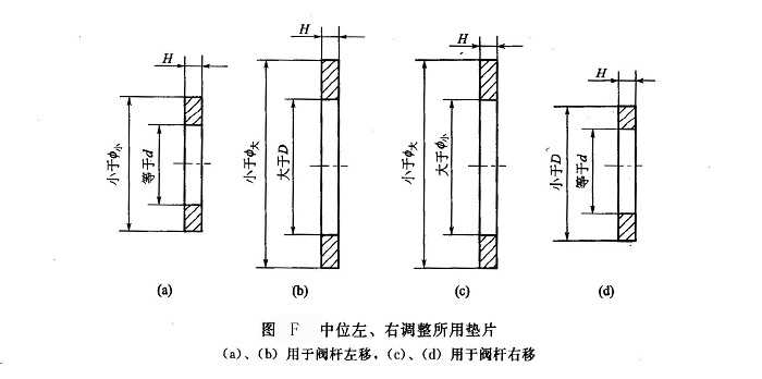 ②方法Ⅱ 若認(rèn)為采用方法I不便,可采用加圓墊片的方法確定閥桿倒角的準(zhǔn)確位置(見(jiàn)圖F)。預(yù)先加工出厚度分別為0.5mm和0.8mm的兩組圓墊片,每組一大一小共兩個(gè),大墊片用來(lái)移動(dòng)閥桿,小墊片用來(lái)防止閥桿竄動(dòng)。用于左移的大墊片內(nèi)徑略大于閥桿直徑D,外徑略小于或等于圖E中后蓋10的內(nèi)徑廬大;小墊片外徑略小于圖F中后蓋10的里端內(nèi)徑聲小,內(nèi)徑等于或略大于閥桿前端直徑d。如欲將閥桿中立位置左移,就將大墊片墊在彈簧座B基準(zhǔn)面后面,小墊片墊在彈簧座基準(zhǔn)面A后面(這樣,閥桿的中立位置就會(huì)左移,而閥桿仍能保持左右沒(méi)有自由竄動(dòng)量,如果只墊大墊片,閥桿就會(huì)有自由竄動(dòng)量);如欲將閥桿向右移動(dòng),就將大墊片墊在彈簧座基準(zhǔn)面A后面,將小墊片墊在彈簧座基準(zhǔn)面B后面,這樣,閥桿的中立位置就會(huì)向右移動(dòng)。每次加裝墊片后(左、右移動(dòng)各有2種厚度的墊片,共有4種狀態(tài))均須裝機(jī)試驗(yàn),最多4次就能找出閥桿上油槽阻礙低壓回油處(對(duì)應(yīng)a腔或b腔);然后,對(duì)阻擋回油的軸肩處進(jìn)行如同方法工那樣的倒角處理即可,但倒角后切不可忘記將所加的墊片取下來(lái);如果加墊片后,閥桿的動(dòng)作正常,可暫時(shí)使用。