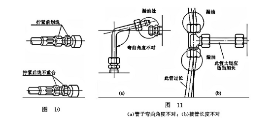 (2)由于管子的彎曲角度不對(duì)[見圖11(a)],以及接管長(zhǎng)度不對(duì)[見圖11(b)],管接頭擴(kuò)口處很難密合,造成泄漏,其泄漏部位如圖所示。為保證不漏,應(yīng)使彎曲角度正確和控制接管長(zhǎng)度適度(不能過長(zhǎng)或過短)。