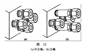 (3)接頭位置靠得太近,不能擰緊,有干涉。在若干個(gè)接頭靠近在一起時(shí),若采用圖12(a)所示的排列,接頭之間困靠得太近,扳手因活動(dòng)空間不夠而不能擰緊,造成漏油。解決辦法是拉開管接頭之間的距離,不行的話可按圖12(b)中的方法解決,可方便擰緊,便于維修。
