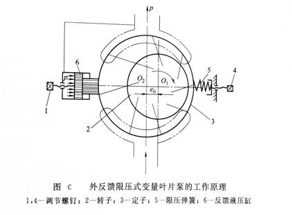 如圖C所示為外反饋限壓式變量葉片泵的工作原理。它是利用排油壓力的反饋作用來實現(xiàn)流量自動調(diào)節(jié)的。轉(zhuǎn)子2的中心O1是固定的,定子3可以左右移動,在限壓彈簧5的作用下,定子被推向左側(cè),使定子中心O2和轉(zhuǎn)子中心O1之間有一初始偏心距e0,它決定了泵的最大流量(e0的大小可由螺釘1調(diào)節(jié))。設(shè)活塞的有效面積為A,泵的壓力為p,則活塞對定子施向右側(cè)的反饋力為pA。當(dāng)pA<F0(彈簧預(yù)壓縮力)時,定子不動,仍保持最大的偏心距e0,液壓泵的流量也保持最大值;當(dāng)泵的壓力升高到某一值pB時,使pBA=F0,pB稱為泵的限定壓力(pB可通過調(diào)節(jié)螺釘4設(shè)定),這也是泵保持最大流量的最高壓力;當(dāng)泵的壓力升高到pA>F0時,反饋力克服彈簧力把定子推向右側(cè),偏心距減小,泵的流量也隨之減小。壓力越高,偏心距越小,泵的流量也越小。當(dāng)泵的壓力達到某一值時,反饋力把彈簧壓縮到最短,定子移動到最右端位置,偏心距減到最小,泵的實際輸出流量為零,泵的壓力便不再升高。
