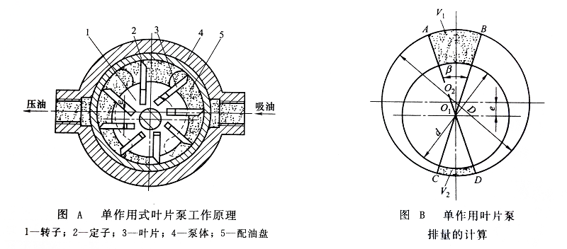 如圖B所示,單作用式葉片泵的轉(zhuǎn)子每轉(zhuǎn)一周時,每兩相鄰葉片間的密封容積變化量為V1-V2 。若近似把AB和CD看作是中心為O1的圓弧,設(shè)定子內(nèi)徑為D,則這兩弧的半徑分別為(D/2+e)和(D/2-e)。設(shè)轉(zhuǎn)子的直徑為d,葉片寬度為b,葉片數(shù)為z,兩相鄰葉片的夾角為β0則有