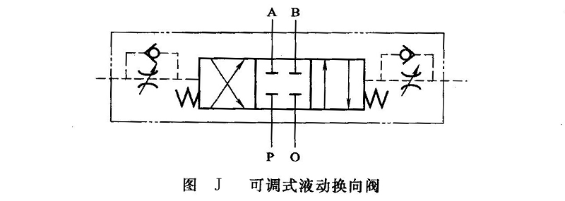 液壓操縱可給予閥芯很大的推力,因此液動換向閥適用于壓力高、流量大、閥芯移動行程長的場合。在液動換向閥的控制油路上往往裝有可調的單向節(jié)流閥(稱阻尼器),以便分別調節(jié)換向閥芯在兩個方向上的運動速度,改善換向性能。阻尼器和液動換向閥可連成一體也可獨立。帶阻尼器的液動換向閥職能符號如圖J所示。