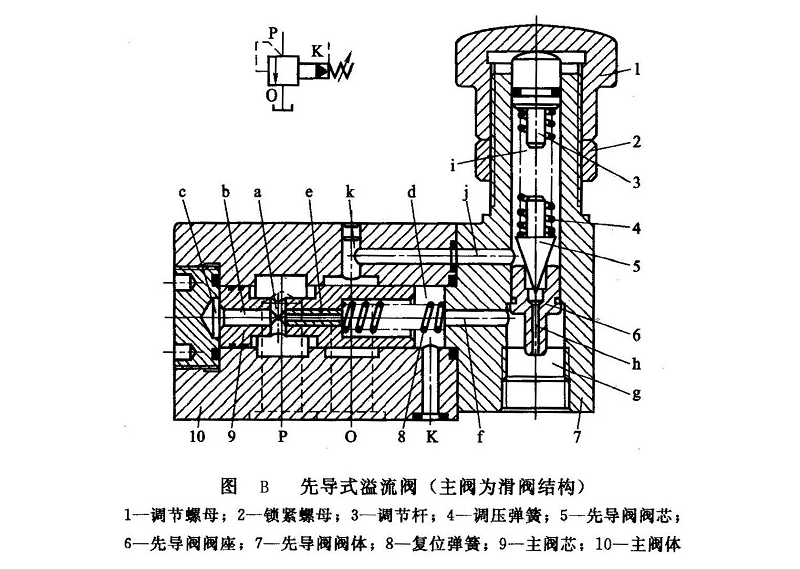 當(dāng)入口油壓升高,使作用于先導(dǎo)閥閥芯5上的液壓力大于先導(dǎo)閥彈簧4的預(yù)緊力時(shí),閥芯5上移,壓縮彈簧4將先導(dǎo)閥口打開(kāi)(經(jīng)過(guò)一段振蕩過(guò)程后停在某一平衡位置上),壓力油便經(jīng)阻尼孔e、孔f、g腔、孔h、j、k流入回油腔。由于油液流經(jīng)阻尼孔e后要產(chǎn)生壓力降,所以主閥芯9右端的油壓力小于左端的油壓力,當(dāng)這個(gè)壓力差較小、還不足以克服復(fù)位彈簧8的作用力時(shí),閥芯9仍然處在最左端。隨著閥入口油壓的不斷升高,這個(gè)壓力差也提高。當(dāng)這個(gè)壓力差對(duì)主閥芯9的作用力超過(guò)復(fù)位彈簧8的作用力時(shí),主閥芯9向右移動(dòng),溢流口開(kāi)啟,將閥的進(jìn)油口P和回油口O接通,實(shí)現(xiàn)溢流。此后,溢流閥入口油壓不再升高,其值為與此時(shí)調(diào)壓彈簧4的預(yù)緊力相對(duì)應(yīng)的某一確定值。調(diào)整調(diào)節(jié)螺母1,通過(guò)調(diào)節(jié)桿3可以改變調(diào)壓彈簧4的預(yù)緊力大小,從而實(shí)現(xiàn)調(diào)整溢流閥的進(jìn)油壓力的作用。這就是先導(dǎo)式溢流閥的定壓過(guò)程。其穩(wěn)壓過(guò)程與直動(dòng)式溢流閥相同,故不贅述。其職能符號(hào)見(jiàn)圖B。