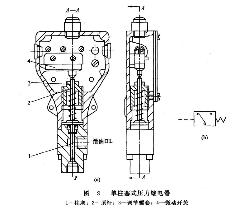 結(jié)構(gòu)與工作原理 圖S所示為單柱塞式壓力繼電器的結(jié)構(gòu)及其職能符號??刂瓶?span lang="EN-US">P和液壓系統(tǒng)相連,當系統(tǒng)壓力達到調(diào)定值時,作用于柱塞1上的液壓力克服彈簧力,頂桿2上推,使微動開關(guān)4的觸點閉合,發(fā)出電信號;當系統(tǒng)壓力下降,彈簧力將柱塞下推,使微動開關(guān)的觸點斷開,電信號消失。
