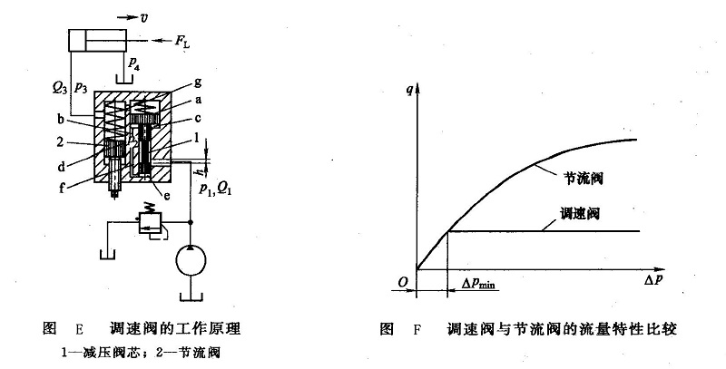 調速閥與節(jié)流閥的流量特性比較如圖F所示。由圖中曲線可以看出,節(jié)流閥的流量隨其進出口壓差的變化而變化;調速閥在其進出口壓差大于一定值后,流量基本不變。但在調速閥進出口壓差很小時,較小的壓差不能使調速閥中的減壓閥芯抬起,減壓閥芯在彈簧力的作用下處在最下端,減壓口全部打開,不起減壓作用,整個調速閥相當于節(jié)流閥的結果,此時流量特性與節(jié)流閥相同(曲線重合部分)。所以要保證調速閥正常工作,應使其進出口最小壓差△pmin >0.5MPa。