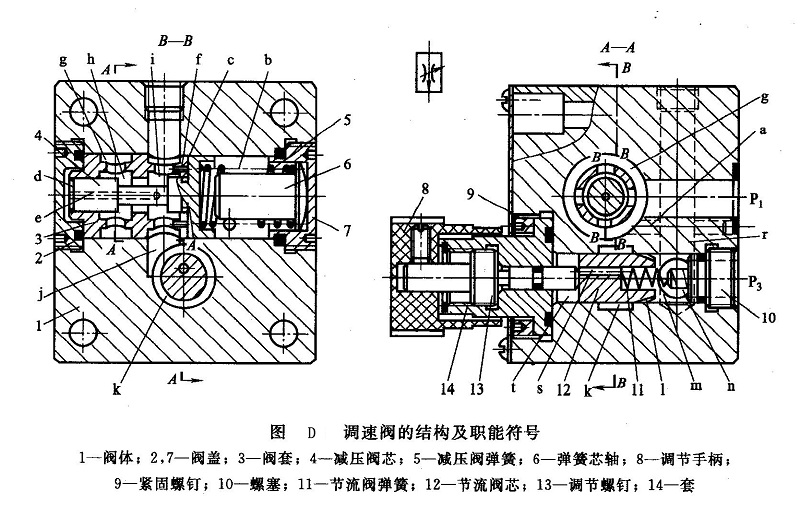圖D所示為調速閥的結構及職能符號。調速閥是由一減壓閥和一普通節(jié)流閥串聯(lián)而成的組合閥。