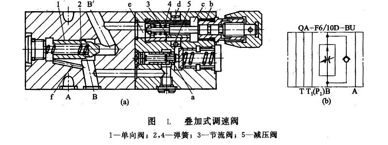 圖L所示為QA-F6/I0D-BU型單向調(diào)速閥。QA表示流量閥,F表示壓力等級(jí)(20MPa),6/10表示該閥芯通徑為Φ6mm,其接口尺寸屬于Φ10mm系列的疊加式液壓閥, BU表示該閥適用于出口節(jié)流調(diào)速的液壓缸B腔油路上,工作原理與一般調(diào)速閥基本相同。