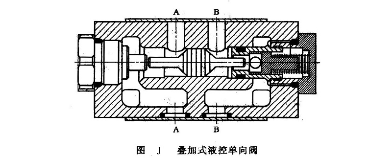 圖J所示為疊加式液控單向閥。其工作原理與一般的液控單向閥相同。圖中油口A和B分別通過單向閥才能與上、下元件相對(duì)應(yīng)的油口相通。