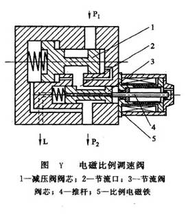 圖Y所示為電磁比例調(diào)速閥結(jié)構(gòu)。它是在普通調(diào)速閥的基礎(chǔ)上,采用比例電磁鐵取代節(jié)流閥或調(diào)速閥的手調(diào)裝置,以輸入電信號(hào)控制節(jié)流口開度,便可連續(xù)地或按