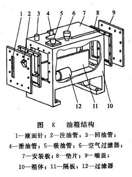 開式油箱的典型結(jié)構(gòu)如圖K所示。隔板11將吸油管5和回油管3、泄油管4隔開。頂部、側(cè)部及底部分別裝有空氣過濾器6、注油管2、液面針1以及過濾器12。安裝液壓泵及其驅(qū)動電動機的安裝板7可固定在油箱的頂面上。油箱的箱體10通常用2.5~5mm鋼板焊接而成。