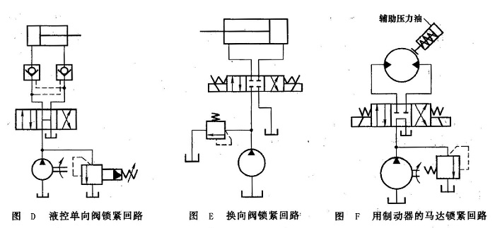 圖E所示為換向閥鎖緊回路。它是利用三位四通換向閥的中位機能(O型或M型)使活塞在行程范圍內(nèi)的任意位置上停止運動并鎖緊。但由于滑閥式換向閥的泄