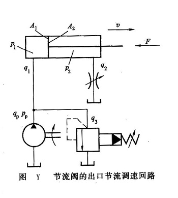 a.油路組成及調(diào)速原理這種調(diào)速回路和進口節(jié)流調(diào)速回路的組成相同,只是將節(jié)流閥串聯(lián)在液壓缸的回油路上,如圖Y所示,借助節(jié)流閥控制液壓缸的排油量q2實現(xiàn)速度調(diào)節(jié)。由于進入液壓缸的流量q1受到回油路上排油量q2的限制,因此用節(jié)流閥來調(diào)節(jié)液壓缸排油量q2,也就調(diào)節(jié)了進油量q1。定量泵多余的油液經(jīng)溢流閥流回油箱。
