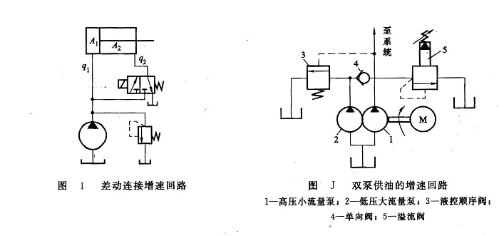 如圖I所示為一差動連接回路。圖示位置時,若二位三通閥通電,液壓缸差動連接,活塞便獲得快速運動,其速度為非差動連接時的A1/(A1-A2)倍。如欲使快進與快退速度相等,則需使A1 =2A2,此時快進(退)速度為工進速度的2倍。