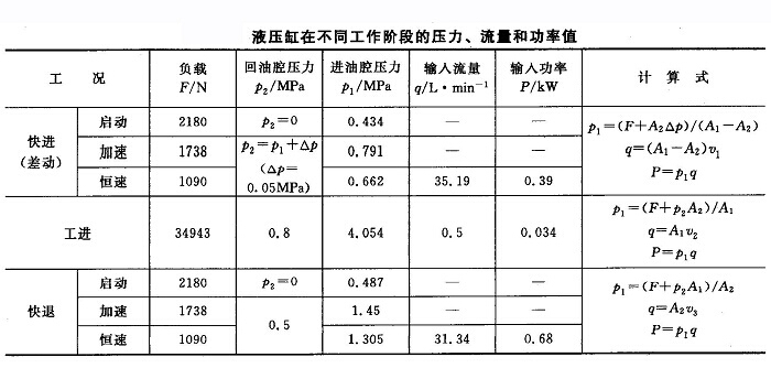 在鉆孔加工時,液壓缸回油路上必須有背壓p2,以防被鉆通時滑臺突然前沖??扇?span lang="EN-US">p2=0.8MPa。快進(jìn)時液壓缸雖然作差動連接,但是由于油管中有壓降△p存在,有桿腔的壓力必須大于無桿腔,估算時可取△p約為0.5MPa。快退時回油腔中有背壓,這時p2也可按0.5MPa估算。