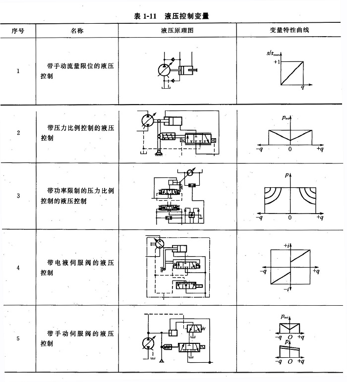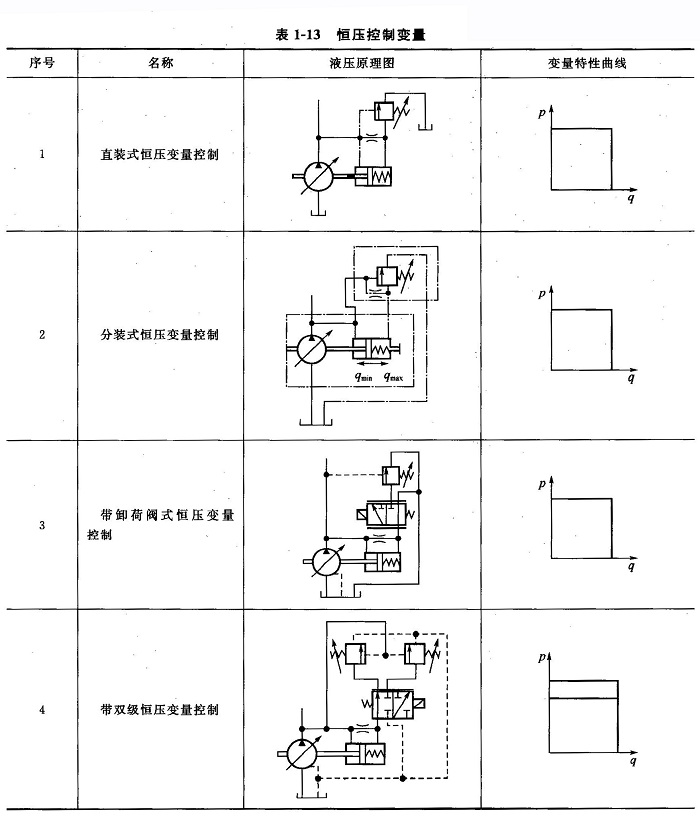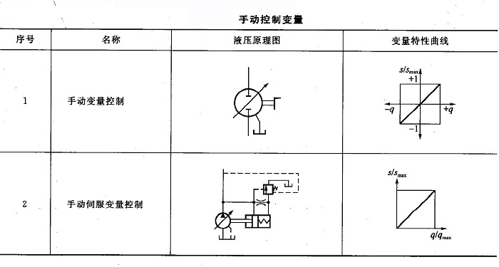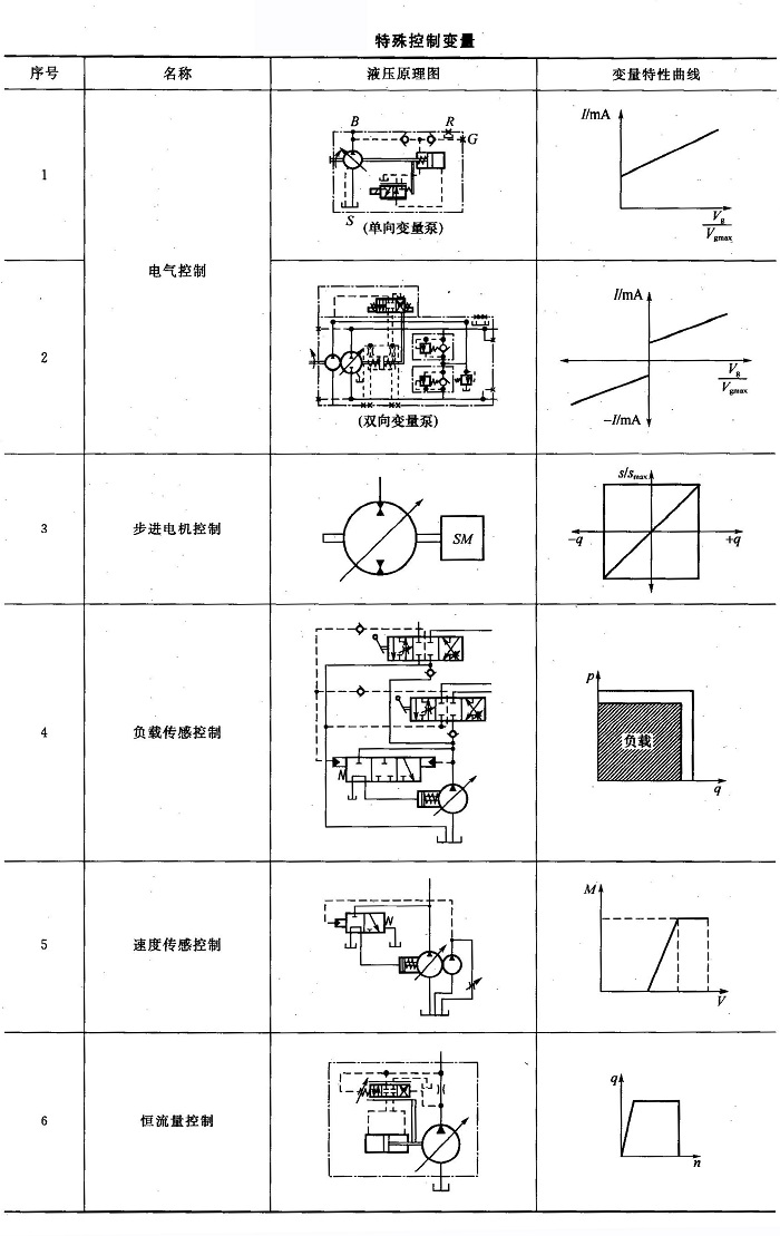 (2)變量控制方式及其特性 通過(guò)改變液壓泵的排量V(幾何參數(shù))調(diào)節(jié)流量時(shí),在泵的轉(zhuǎn)速恒定時(shí),泵的排出流量發(fā)生變化,可形成流量控制泵。由于泵的出口總有阻力負(fù)載存在,故泵出口流量的變化將影響泵的出口壓力。有時(shí)控制泵的排量還能控制泵的工作壓力,形成壓力控制變量泵??梢娮兞靠刂品绞椒N類繁多。工程實(shí)際中,軸向柱塞泵在結(jié)構(gòu)上最適宜安裝各種變量控制機(jī)構(gòu),故變量控制方式最多。葉片泵也可安裝若干變量控制機(jī)構(gòu)。一些典型的變量控制方式見下表。