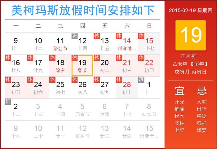 根據(jù)國務(wù)院辦公廳關(guān)于2015年春節(jié)放假安排時(shí)間的通知,并結(jié)合公司的實(shí)際情況,經(jīng)研究決定,美柯瑪斯2015年春節(jié)放假安排相關(guān)事宜作如下安排: