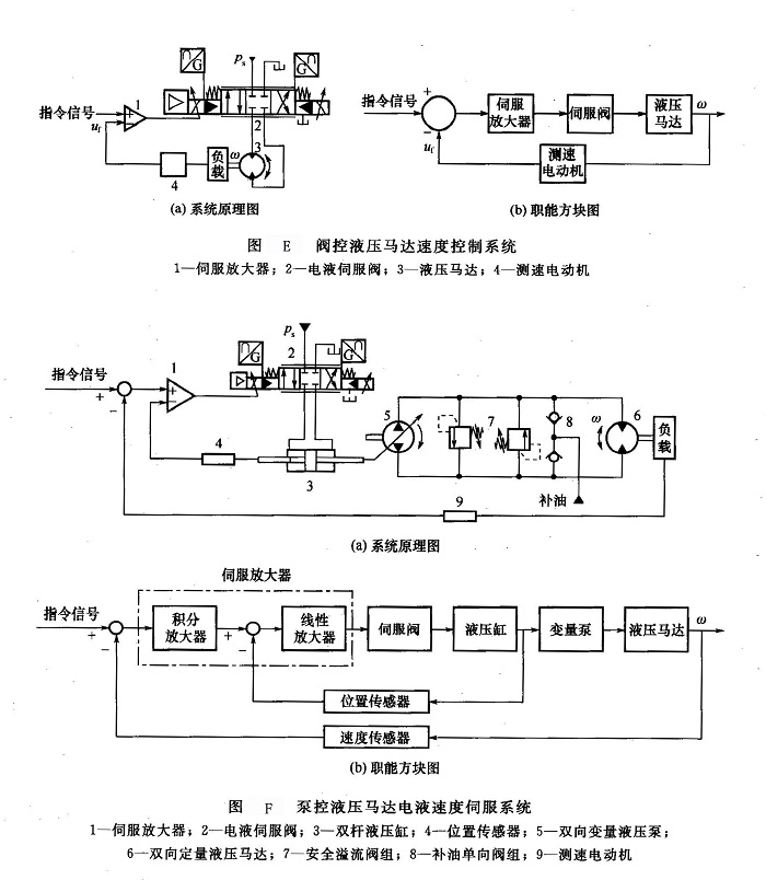 (l)閥控液壓馬達(dá)系統(tǒng)由于節(jié)流損失較大,故效率不高,但響應(yīng)速度快、控制精度高,多用于中小功率系統(tǒng)。典型的閥控液壓馬達(dá)速度控制系統(tǒng)原理如圖E(a)所示,圖E(b)為職能方塊圖。系統(tǒng)用于控制負(fù)載的速度,使之按照指令信號(hào)給定的規(guī)律變化。測(cè)速電動(dòng)機(jī)4的軸與負(fù)載軸相連,用于檢測(cè)負(fù)載軸的速度,檢測(cè)到的速度信號(hào)w與指令信號(hào)之差(誤差信號(hào))經(jīng)伺服放大器1進(jìn)行功率放大,產(chǎn)生的電流去控制電液伺服閥2的閥芯位置,電液伺服閥輸出壓力油驅(qū)動(dòng)和控制液壓馬達(dá)3及負(fù)載的旋轉(zhuǎn)。