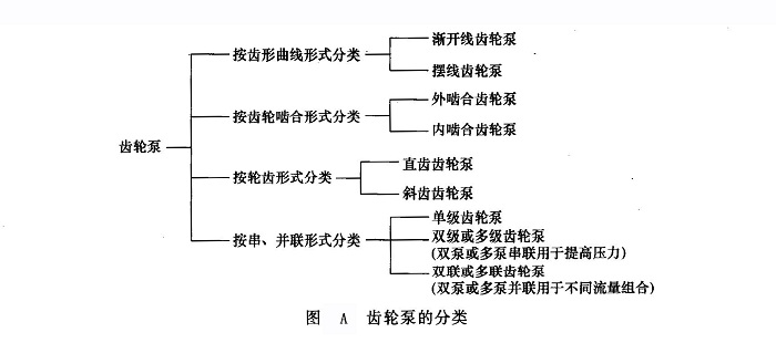 (l)分類齒輪泵是以嚙合原理工作的液壓泵,它是現(xiàn)代液壓技術(shù)中結(jié)構(gòu)最為簡單、價格最低、產(chǎn)量及用量最大的一種液壓泵,其詳細分類如圖A所示。在各種齒輪泵中,由于標準的漸開線外嚙合直齒齒輪泵的齒輪容易加工和檢測,故應(yīng)用最為普遍。這種齒輪泵中大多采用一對參數(shù)相同的齒輪,只有個別特殊用泵有三個或更多齒輪。