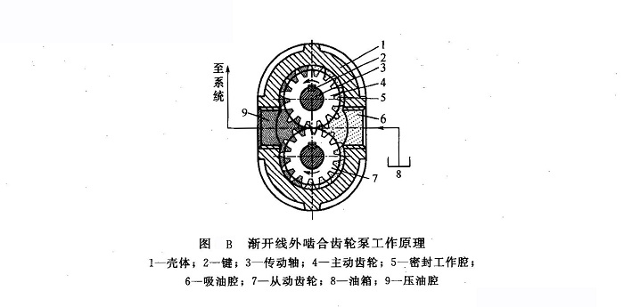 圖B所示為采用一對齒輪的漸開線外嚙合齒輪泵工作原理,幾何參數(shù)相同的主動齒輪4和從動齒輪7被封閉在齒廓、殼體1和側(cè)蓋板等構(gòu)成的密封的空間中而嚙合。殼體1、側(cè)蓋板和齒輪的各個齒谷(齒間)組成了許多密封工作腔5。齒輪的齒頂和殼體內(nèi)孔表面間及齒輪端面和側(cè)蓋板之間的間隙很小,而且嚙合齒的接觸面接觸緊密、起密封作用并把吸、壓油區(qū)隔開(配流作用)。當(dāng)原動機通過傳動軸3帶動主動齒輪4及從動齒輪7按圖示方向運轉(zhuǎn)時,在吸油腔6由于輪齒脫離嚙合使齒間容積變大,出現(xiàn)真空而從油箱8吸油;吸入的油液由旋轉(zhuǎn)的齒谷(齒間)攜帶至壓油腔9;在壓油腔由于齒間容積減小而將油壓至系統(tǒng)。泵軸旋轉(zhuǎn)一周,每個工作腔吸、壓油各一次。原動機帶動泵連續(xù)運轉(zhuǎn)時,泵便連續(xù)地、周期性地壓油。