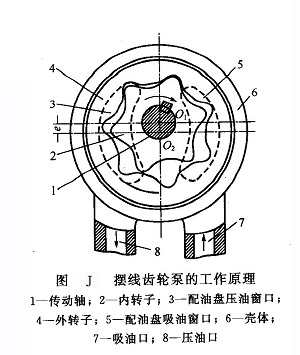 (3)擺線齒輪泵的工作原理擺線齒輪泵又稱轉(zhuǎn)子泵,其齒形為擺線,外轉(zhuǎn)子比內(nèi)轉(zhuǎn)子多一個齒。擺線齒輪泵的工作原理如圖J所示。殼體6上開有通油箱的吸油口7和通系統(tǒng)的壓油口8。外轉(zhuǎn)子4比內(nèi)轉(zhuǎn)子2多一個齒,且內(nèi)、外轉(zhuǎn)子之間有偏心距e。在工作時,內(nèi)轉(zhuǎn)子所有的輪齒均進入嚙合。各相鄰齒的嚙合線、殼體與兩側(cè)的配油盤形成幾個封閉工作容腔。隨著內(nèi)轉(zhuǎn)子繞中心01順時針方向轉(zhuǎn)動,外轉(zhuǎn)子繞02中心同向異速旋轉(zhuǎn)。