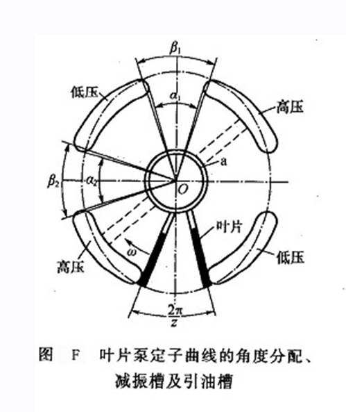 為了保證吸油腔與壓油腔之間的密封及避免困油現(xiàn)象,定子內(nèi)表面曲線的角度分配應(yīng)滿足一定條件。圖F所示為配流盤與定子曲線相對位置關(guān)系,可以看到:若泵的葉片數(shù)為z,為了保證吸油腔與壓油腔之間的密封,大圓弧區(qū)段及小圓弧區(qū)段的吸、排油腔之間的密封角α1和α2應(yīng)滿足的條件為α1≥2π/z和α2≥2π/z。為了避免發(fā)生困油現(xiàn)象,應(yīng)使兩封油葉片之間的容腔在α1和α2角度范圍內(nèi)移動時(此時容腔與高、低壓腔均不相通),其容積大小保持不變,即保證大圓弧區(qū)段及小圓弧區(qū)段對應(yīng)的中心角βl和β2滿足βl≥a1和β2≥α2。