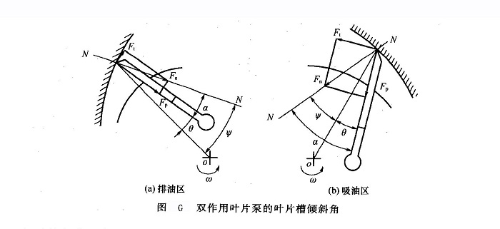 e.葉片前傾安放 當(dāng)葉片在壓油區(qū)沿定子曲線滑動時,定子內(nèi)表面對葉片的法向接觸反力Fn可分解為沿葉片槽方向的分力Fp和橫向分力Ft,由于葉片的外伸部分是懸臂梁結(jié)構(gòu),故橫向分力會在葉片與槽側(cè)壁的接觸處產(chǎn)生較大的摩擦力,葉片與定子曲線的接觸壓力角α(定子曲線接觸點處的法線方向與葉片方向的夾角)越小,橫向分力Ft=Fnsinα越小,越有利于葉片在其槽內(nèi)自如滑動,并減小摩擦力從而減少葉片與槽之間的磨損。故葉片槽不徑向開設(shè),而是順轉(zhuǎn)向前傾一個角度θ(通常θ=10°~14°)開設(shè),使α<φ,即α=φ-θ[圖G(a)]。否則,壓力角a=φ將較大,Ft也較大。但這樣做的結(jié)論并不適用于吸油區(qū)[圖G(b)],一方面在吸油區(qū)葉片槽前傾反而使壓力角α增大,變?yōu)棣?span lang="EN-US">=φ+θ,使葉片的受力情況更加惡化;另一方面葉片沿定子曲線滑動時,其頂部實際上除了受到定子內(nèi)表面反作用力外,還受到與滑動方向相反的摩擦力Ff作用,兩者的合力F才是計算有害橫向分力Ft的依據(jù),故上述僅以法向接觸反力Fn作為依據(jù)勢必得出壓力角越小越好的錯誤結(jié)論。新的觀點認(rèn)為取θ=0°更為合理,目前國外一些雙作用葉片泵的葉片槽是徑向開設(shè)的,所以關(guān)于葉片安放角問題仍值得進(jìn)行深入探討。