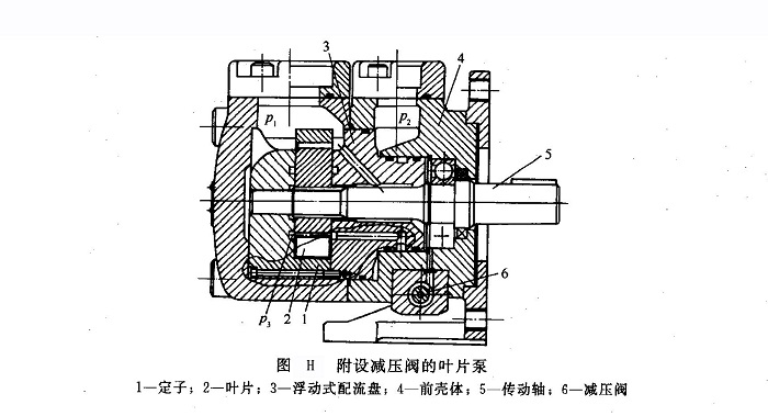 i.減壓引油方式 圖H所示為附設(shè)定值減壓閥和采用浮動(dòng)配流盤(pán)的葉片泵。泵的壓油腔經(jīng)泵內(nèi)附設(shè)的定值減壓閥6降低壓力后引入吸油區(qū)葉片槽底部,從而減小葉片2對(duì)定子1的作用力。此法有可能達(dá)到優(yōu)化的推力值。但減壓閥不僅復(fù)雜價(jià)昂,而且自身要消耗一部分輸出流量,致使泵的容積效率降低;而簡(jiǎn)單的節(jié)流槽又難以完全滿(mǎn)足壓力分布的要求,故目前已很少采用。