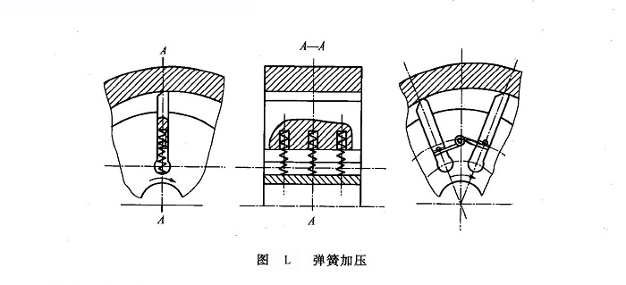 iii.彈簧加壓如圖L所示,在轉(zhuǎn)子槽底部預(yù)設(shè)了幾根壓縮彈簧(圓柱彈簧或燕形彈簧)幫助葉片外伸,當(dāng)槽底與同相位的配流窗口連接時(shí),葉片端部對(duì)滑道的壓緊力僅取決于泵的轉(zhuǎn)速及接觸位置的矢徑值,而與工作壓力無(wú)關(guān)。此結(jié)構(gòu)的優(yōu)點(diǎn)還在于葉片的運(yùn)動(dòng)不會(huì)影響泵的瞬時(shí)排量。缺點(diǎn)是需在轉(zhuǎn)子槽底部鉆孔,對(duì)強(qiáng)度有不利影響,同時(shí)也常常難以滿(mǎn)足對(duì)彈簧疲勞強(qiáng)度的要求。