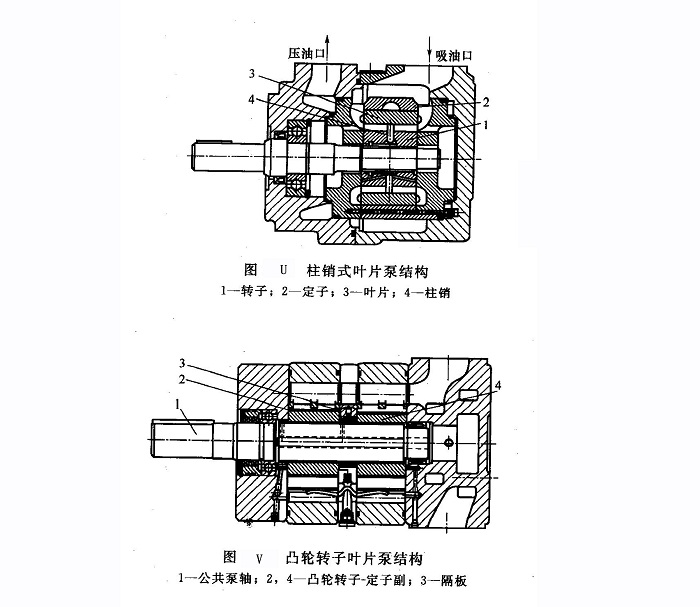 ④凸輪轉(zhuǎn)子葉片泵 圖V所示為凸輪轉(zhuǎn)子葉片泵結(jié)構(gòu)。為了減少輸出流量的脈動(dòng),雙作用泵除凸輪上采用專門(mén)的過(guò)渡曲面外,由裝于公共泵軸l上的相位相差90°的兩個(gè)凸輪轉(zhuǎn)子一定子副2和4組合而成,兩個(gè)單元悶用隔板3分開(kāi),但相通。這樣的泵兩組工作容積互相補(bǔ)償,且又沒(méi)有困油現(xiàn)象,流量脈動(dòng)和噪聲都很小。