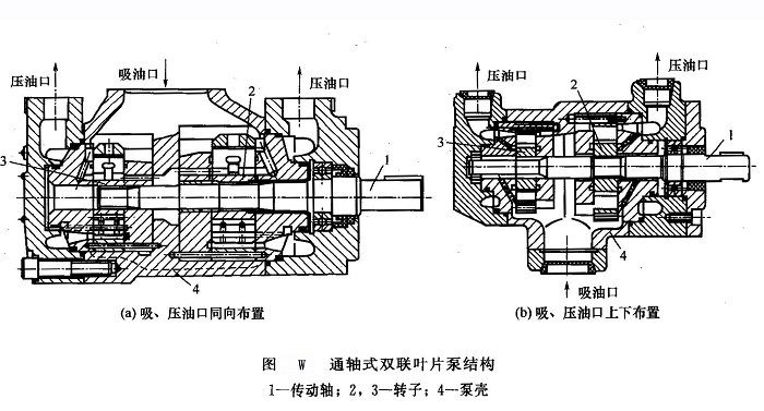 ⑤雙聯(lián)葉片泵幾乎所有形式的單葉片泵都可以組合成為雙聯(lián)泵結(jié)構(gòu),但組合形式又有所區(qū)別。常見(jiàn)的結(jié)構(gòu)組合形式有通軸式和法蘭式兩種。圖W所示為通軸式雙聯(lián)葉片泵結(jié)構(gòu)。在一個(gè)泵殼4內(nèi)的一根傳動(dòng)軸l的兩端,分別裝有兩個(gè)轉(zhuǎn)子2和3,形成排量不同的大小泵且兩者共用一個(gè)吸油口,但壓油口分開(kāi)[圖W(a)的吸、壓油口均布置在泵殼的上方;而圖W(b)的吸油口布置在泵殼的下方,壓油口布置在泵殼的上方]。法蘭式是將兩臺(tái)獨(dú)立單泵通過(guò)連接法蘭直接組合成雙聯(lián)泵。