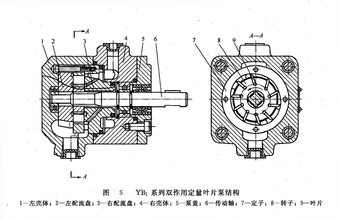 ①YB1系列雙作用定量葉片泵該系列雙作用葉片泵是在我國(guó)最早引進(jìn)前蘇聯(lián)HY02技術(shù)生產(chǎn)的YB1型葉片泵基礎(chǔ)上經(jīng)改進(jìn)設(shè)計(jì)而成的液壓泵,其結(jié)構(gòu)如圖S所示。該系列泵由左殼體1、右殼體4、轉(zhuǎn)子8、葉片9、定子7、左配流盤(pán)2、右配流盤(pán)3、泵蓋5及傳動(dòng)軸6等構(gòu)件組成。右配油盤(pán)上的O形密封圈可有效防止軸端泄漏,密封可靠。泵的左、右配流盤(pán)及定子、轉(zhuǎn)子和葉片可先組裝成一個(gè)部件(簡(jiǎn)稱為泵芯)裝入殼體。此組合部件由兩個(gè)緊固螺釘提供初始預(yù)緊力,以便泵啟動(dòng)時(shí)能建立起壓力。建立壓力后,配油盤(pán)和定子組件靠右配油盤(pán)右側(cè)的液壓力壓緊,壓緊力隨壓力增大而增大,自動(dòng)補(bǔ)償軸向間隙,保證泵有較高的容積效率。YB1系列葉片泵可反轉(zhuǎn),任意兩個(gè)不同排量的單泵可組成雙聯(lián)泵,單、雙聯(lián)泵共有119個(gè)不同規(guī)格,單泵最大排量為100mL/r,額定壓力為7MPa。結(jié)構(gòu)簡(jiǎn)單,壓力脈動(dòng)和噪聲小,壽命長(zhǎng)。YB-D系列葉片泵的結(jié)構(gòu)基本與YB1系列泵相同,只是其定子進(jìn)行了氮化處理,殼體壁厚加大,額定壓力增加到1OMPa。