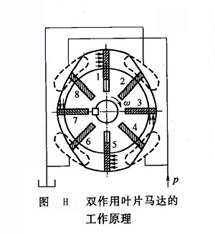 以雙作用葉片馬達(dá)(圖H)為例,說明葉片馬達(dá)的工作原理。由圖H可見,葉片1~8將前、后端蓋和轉(zhuǎn)子及定子間形成的環(huán)狀空間沿圓周分割為與葉片數(shù)量相同的密封工作腔,當(dāng)壓力油通過配流盤左上角和右下角的兩個(gè)進(jìn)油窗口進(jìn)入密封工作腔后,葉片1、3、5、7的一側(cè)受到油壓p作用,另一側(cè)通過左下角和右上角的排油窗口回油;而葉片2、4、6、8兩側(cè)壓力相同。由于葉片1的承壓面積大于葉片7的承壓面積,因此便產(chǎn)生轉(zhuǎn)矩。同理,葉片5的承壓面積大于葉片3的承壓面積,也產(chǎn)生轉(zhuǎn)矩。其合成轉(zhuǎn)矩驅(qū)動(dòng)轉(zhuǎn)子以角速度ω順時(shí)針方向旋轉(zhuǎn),輸出機(jī)械能。