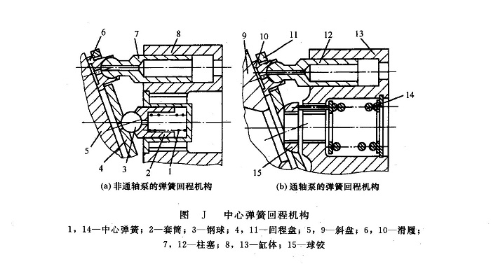 點接觸式泵的柱塞靠分散布置在每個柱塞底部的彈簧使柱塞外伸(回程),靠斜盤作用縮回,自吸能力較差,而且因彈簧高頻工作極易引起疲勞破壞,故此種結構已很少采用。通常軸向柱塞泵采用圖J所示的中心彈簧回程機構,中心彈簧1的彈簧力通過套筒、鋼球或球鉸、回程盤帶動滑履和柱塞回程,而靠斜盤強迫縮回,自吸能力較強,而且在這種結構中,彈簧承受靜載荷,其壓縮量不隨泵主動軸的轉動而變,故彈簧不會產(chǎn)生疲勞破壞。目前,這種結構在軸向柱塞泵中被廣泛采用。