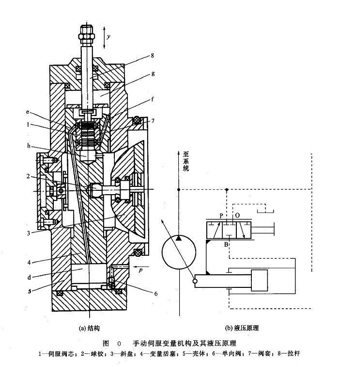 a.手動伺服變量機構(gòu) 圖O(a)所示為典型的手動伺服變量機構(gòu)結(jié)構(gòu),它由伺服閥芯1(與拉桿8相連)、變量活塞4和殼體5等零件組成。變量活塞上端的有效面積大于下端的有效面積。同伺服閥芯相配合的閥套7與變量活塞4制成一體。閥套和變量活塞的三個孔道(腔)e、f、h分別與變量活塞的下腔d、上腔g和泵體內(nèi)腔相通,泵體內(nèi)腔通過泄油LI與油箱相通。變量活塞4上下移動時,通過球鉸2使斜盤3的傾角發(fā)生變化。泵輸出的液壓油經(jīng)單向閥6進入變量活塞4的下腔d,液壓力作用在變量活塞4的下端。當(dāng)與伺服閥芯1相連接的拉桿8不動時[圖O(a)所示狀態(tài)],變量活塞4的上腔g處于封閉狀態(tài),變量活塞不動而處于平衡狀態(tài),斜盤3的傾角保持不變。