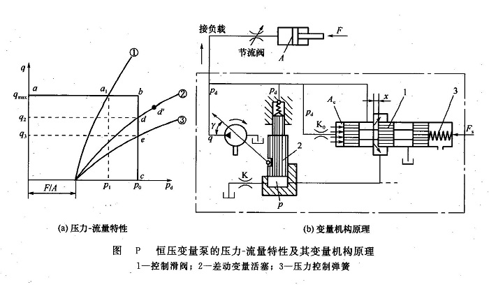 當(dāng)泵的工作壓力pd<p0時(shí),滑閥1的開度x=O,差動(dòng)變量活塞2大直徑端的壓力p=0,在小直徑端油壓pd的推動(dòng)下,活塞2將斜盤推向γ最大的位置,使泵保持最大流量qmax[圖P(a)中的水平線ab]。當(dāng)泵的工作壓力增大到泵的給定值,即pd =p0時(shí),滑閥1左端的液壓推力pdAc將克服彈簧力Fs,把閥口打開,形成一開度為x的可變節(jié)流口,它和固定節(jié)流器K構(gòu)成串聯(lián)阻力回路。利用該阻力回路可控制差動(dòng)變量活塞2的大端壓力p:當(dāng)開度x增大,壓力p升高,當(dāng)x增大到一定程度,壓力p便能推動(dòng)差動(dòng)變量活塞2向上移動(dòng),帶動(dòng)斜盤,使γ減小,泵的流量也隨之減小。因先導(dǎo)控制滑閥1不直接推動(dòng)斜盤,只是對推動(dòng)斜盤的差動(dòng)變量活塞2起控制作用,故尺寸可做得非常小,因此彈簧3的剛度也很小。所以當(dāng)pd=p0時(shí),控制滑閥1的閥口開度,在理論上可以是任意的,差動(dòng)變量活塞位置及斜盤角γ也都具有任意性。這表示當(dāng)pd=p0時(shí),泵可能在q=0到q=qmax之間的任一流量下工作[圖P(a)中的恒壓線bc]。如果外部負(fù)載過大,要求泵的壓力pd>p0,則泵是不能工作的。因?yàn)楫?dāng)pd達(dá)到p0并有繼續(xù)升高的趨勢時(shí),控制滑閥1的開度x早已達(dá)到最大,差動(dòng)變量活塞大端壓力也達(dá)到最大,將斜盤推到γ=O的位置,使輸出流量為零。在實(shí)際應(yīng)用中需采用帶節(jié)流阻力的負(fù)載與恒壓泵在恒壓區(qū)匹配工作。圖P(a)中的曲線①、②、③是三條節(jié)流負(fù)載的阻力一流量特性曲線,它們和bc恒壓線交于d、P。節(jié)流負(fù)載的特點(diǎn)是不要求固定的壓力,一個(gè)工作壓力便對應(yīng)一個(gè)確定的流量,而且隨壓力的增高流量也增大。這樣一來,節(jié)流阻力一流量特性曲線②、③和恒壓泵的恒壓特性線bc的交點(diǎn)d、e便是穩(wěn)定的工況點(diǎn)。形成這些工況點(diǎn)的過程是:假如受干擾,工作點(diǎn)偏移,例如工作點(diǎn)d沿阻力一流量特性曲線移到d′點(diǎn),流量增大,泵的工作壓力也隨之高于p0,這樣就破壞了控制滑閥1的受力平衡狀態(tài),接著出現(xiàn)閥口開度x增大、差動(dòng)變量活塞大端壓力增大、斜盤角γ減小使流量減少。這個(gè)反饋過程一直要到工況點(diǎn)恢復(fù)到原來的d點(diǎn)為止。由此可見,恒壓變量泵確實(shí)能提供一個(gè)壓力為p0的恒壓油源。圖A為恒壓變量泵的實(shí)際特性曲線,調(diào)節(jié)控制彈簧改變Fs即可得到壓力不同的恒壓特性。恒壓變量泵可用于液壓系統(tǒng)保壓,輸出流量只補(bǔ)償系統(tǒng)泄漏;用作電液伺服系統(tǒng)的恒壓油源;用于節(jié)流調(diào)速系統(tǒng)。