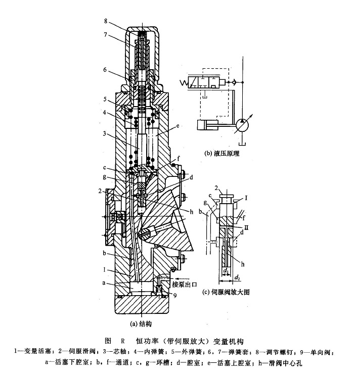 圖R(a)為一種恒功率(帶伺服放大)變量泵的變量機(jī)構(gòu)。伺服滑閥2裝在變量活塞1內(nèi),故伺服滑閥和變量活塞構(gòu)成直接的位置反饋關(guān)系。來自泵出口的高壓油通過單向閥9進(jìn)入變量活塞下腔室a,并通過變量活塞中的孔道b引至滑閥的d腔和c腔 [圖R(c)]??刂苹钊?span lang="EN-US">d腔的承壓面積為(π/4)(d 2 2-d 22),此承壓面積上的液壓力與伺服滑閥上的彈簧力相平衡。如液壓力大于彈簧力,則滑閥上移,變量活塞上腔的油液通過孔道f再經(jīng)被打開的控制閥口及中心孔h至回油腔,因而活塞上腔壓力下降。當(dāng)變量活塞上腔壓力下降到pl≤p(A2/A1)時(A1、A2分別為變量活塞上、下端面承壓面積),變量活塞上移,并推動變量機(jī)構(gòu)使泵變量。