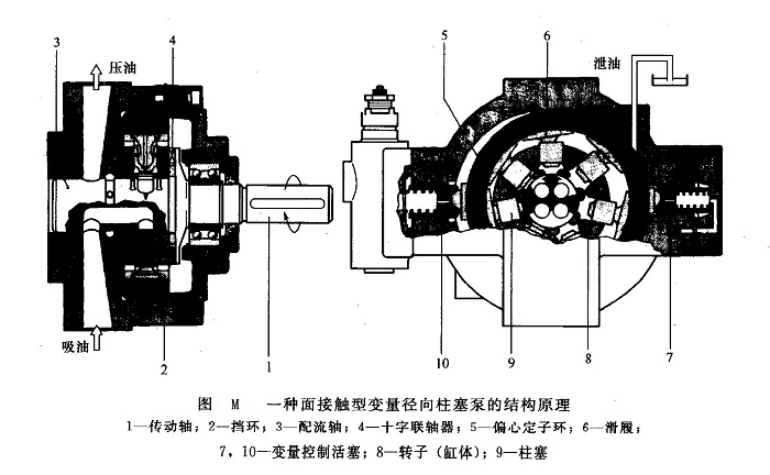 ②面接觸型徑向柱塞泵 圖M所示為一種面接觸型變量徑向柱塞泵的結(jié)構(gòu)原理。傳動軸1通過十字聯(lián)軸器4帶動徑向力平衡的星形轉(zhuǎn)子(缸體)8旋轉(zhuǎn)。轉(zhuǎn)子支承在配流軸3上。裝在轉(zhuǎn)子孔內(nèi)的柱塞9通過靜壓平衡的滑履6緊貼在偏心定子環(huán)5上。柱塞與滑履為球鉸連接,并由卡環(huán)鎖定。由兩個擋環(huán)2將滑履約束在偏心定子環(huán)內(nèi),運轉(zhuǎn)時由離心力和液壓力將滑履壓向偏心定子環(huán)。當缸體旋轉(zhuǎn)時由于偏心定子環(huán)的作用,柱塞就形成往復運動,它的行程為偏心定子環(huán)偏心距的2倍。定子環(huán)的偏心位置可由在泵體上徑向相對位置的變量控制活塞7、10調(diào)節(jié)。吸油和壓油通過泵體和配流軸上的流道,并可由配流軸上的進、出油口控制。由于在泵內(nèi)柱塞與定子環(huán)內(nèi)表面通過上端為圓弧面的滑履緊貼(面接觸),且產(chǎn)生的作用于內(nèi)表面的液壓力是完全靜壓平衡的,支承傳動軸的滾動軸承只受到外力作用,所以,泵的壽命較長。德國博世(BOSCH)公司生產(chǎn)的RKP型徑向柱塞泵即為此種結(jié)構(gòu),其最高工作壓力為38.5MPa,流量范圍為16~90mL/r,最高轉(zhuǎn)速為3500r/min。