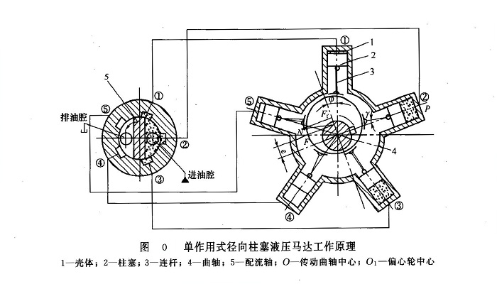 (1)單作用式徑向柱塞馬達的工作原理 如圖O所示,曲軸連桿式徑向柱塞馬達沿殼體1的圓周放射狀均勻布置了五個(或七個)缸,缸中的柱塞2通過球鉸與連桿3相連接,連桿端部與曲軸4的偏心輪(偏心輪的圓心為O1,曲軸旋轉(zhuǎn)中心為O,兩者的偏心距為e)相接觸,曲軸的一端為輸出軸,另一端則通過十字聯(lián)軸器與配流軸5連接。配流軸上“隔墻”兩側(cè)分別為進油腔和排油腔。