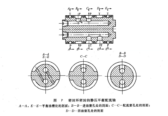 ③配流副 圖O所示馬達為軸配流。由于配流軸的一側(cè)為高壓腔,另一側(cè)為低壓腔,故配流軸工作過程受到很大的徑向力,此徑向力將配流軸推向一側(cè),而使另一側(cè)間隙加大,造成滑動表面的磨損和泄漏量的增加,致使效率下降。為此,常采取開設(shè)對稱平衡油槽的措施以平衡徑向力。如圖P所示為采用密封環(huán)密封的靜壓平衡配流軸,正中的C-C窗孔是配流窗孔,B-B和D-D上的環(huán)形槽分別是進油和回油窗孔,A-A和E-E是靜壓平衡半圓環(huán)形槽。假定各密封環(huán)分別放置在密封帶的正中。若進、出油方向如圖P中箭頭所示,各孔標有符號P的都是高壓腔,標有符號T的都是低壓腔??梢?, B-B和D-D圓周方向的壓力都相同,沒有徑向力產(chǎn)生;C-C窗孔剖面的上腔與進油口相通,是高壓側(cè),下腔與回油口相通,是低壓側(cè),因此使配流軸受到很大的徑向力。為了平衡這個徑向力,在配流軸兩端設(shè)置半圓環(huán)形平衡油槽A-A和E-E,使其上腔通高壓油,為了減小泄漏,各腔之間設(shè)有密封環(huán)。為了保證上、下兩側(cè)靜壓平衡,配油窗口和平衡油槽的相關(guān)尺寸應(yīng)滿足如下關(guān)系式: