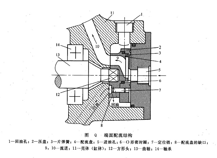 圖Q所示為曲軸連桿液壓馬達的端面配流結(jié)構(gòu)。曲軸13通過方形頭12帶動配流盤4與壓盤2同步旋轉(zhuǎn),轉(zhuǎn)動中實現(xiàn)配流。啟動或空載運轉(zhuǎn)時靠片彈簧(碟形彈簧)3使配流盤和壓盤貼緊缸體11與端蓋,設(shè)計時保證貼緊力大于配流盤與缸體間的分離力,工作時由液壓實現(xiàn)貼緊。但這一結(jié)構(gòu)因分離力與貼緊力不重合而使配流盤存在傾側(cè)力矩。通過采用靜壓平衡結(jié)構(gòu)設(shè)計,可使端面配流副實現(xiàn)理論上完全平衡。