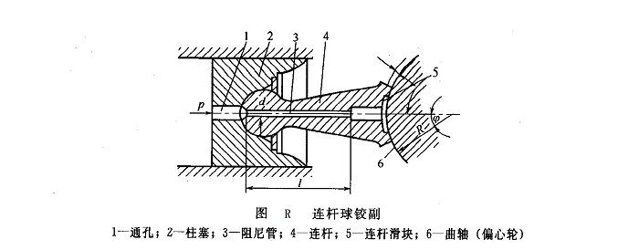 ④連桿副 除了配流副外,曲軸連桿液壓馬達的性能在很大程度上取決于連桿運動副。連桿球鉸副的典型結(jié)構(gòu)如圖R所示。它由連桿4的球頭與柱塞2的球窩,連桿滑塊5的底部與曲軸(偏心輪)6兩對摩擦副組成。連桿滑塊底部與曲軸(偏心輪)間早期為金屬接觸,滑塊底部澆鑄耐磨合金,以減小摩擦力。有的馬達曲軸(偏心輪)上裝有滾子軸承,用滾動摩擦替代滑塊底部與偏心輪間的滑動摩擦;目前多數(shù)馬達在該處設(shè)計成靜壓平衡或靜壓支承。滑塊底部設(shè)置油室,壓力油通過連桿中心阻尼器進入底部油室。工作中滑塊不浮起,油室中液體壓力平衡大部分柱塞推力,并使摩擦副得到良好潤滑。