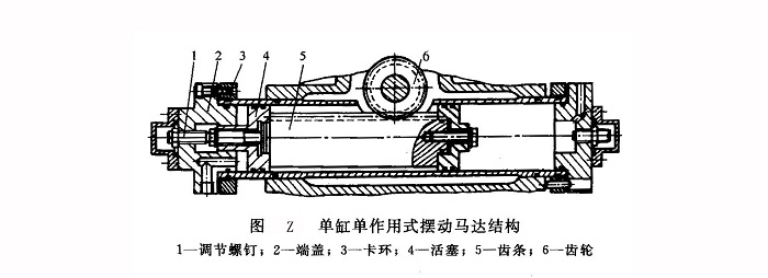 ①單缸單作用式擺動馬達(dá)(圖Z) 在單缸單作用式擺動馬達(dá)中,作活塞桿用的齒條5和齒輪6嚙合作為機(jī)械轉(zhuǎn)換器。當(dāng)輸入壓力油時,活塞4推動齒條作直線移動,經(jīng)齒輪將直線移動轉(zhuǎn)換為旋轉(zhuǎn)運(yùn)動,由齒輪軸輸出轉(zhuǎn)矩?;钊谐碳摧敵鲛D(zhuǎn)角大小的控制可通過螺釘1調(diào)節(jié)。這種擺動馬達(dá)的優(yōu)點(diǎn)是結(jié)構(gòu)簡單,位置精度便于控制,應(yīng)用廣泛。