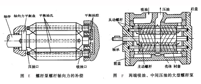 a.軸向力及其平衡在螺桿泵中,工作介質(zhì)的壓力沿軸線逐漸升高,這一壓差對(duì)螺桿副產(chǎn)生一個(gè)由壓油腔指向吸油腔的軸向推力,它將使螺桿間的摩擦力增大,加劇各配合表面的磨損并降低機(jī)械效率。常用的軸向力平衡措施如下(圖E)。