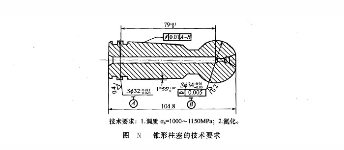 錐形柱塞的加工工藝過程為:下料,鋸切為單件→模鍛成形→調(diào)質(zhì)熱處理→銑兩端面→鉆中心孔→車削成形→粗磨→氮化熱處理→精磨→終驗(yàn)入庫。