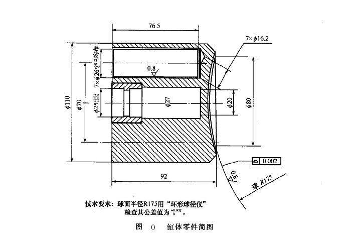 缸體零件簡(jiǎn)圖如圖O所示。缸體的典型加工工藝過程為:正火→粗車外圓及中心孔→粗車:仿形車R175球面→鉆七個(gè)柱塞孔→雙金屬澆鑄球面→半精車端面外圓→調(diào)頭車端面、基準(zhǔn)外圓及中心孔→擴(kuò)七個(gè)柱塞孔→精車:仿形車R175球面→鉆七個(gè)斜孔→氣體氮化→壓柱塞銅套及中心軸套→磨外圓→粗鏜七個(gè)柱塞孔→精鏜七個(gè)柱塞孔→精磨R175球面→清洗去毛刺→終驗(yàn)入庫。