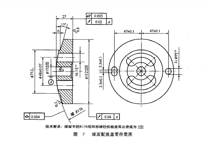 球面配流盤零件簡(jiǎn)圖如圖P所示。球面配流盤的典型加工工藝過程為:調(diào)質(zhì)→粗車兩端面及外圓→半精車外圓,鏜中心孔→精車:仿形車R176球面→鉆腰形槽四孔及定位銷孔→銑腰形槽→粗磨外圓→粗磨端面→粗磨R176球面→集中倒棱、去刺、清洗→氣體氮化→精磨端面→壓人中心襯套→精磨中心孔→精磨R176球面→集中清洗→終驗(yàn)入庫。
