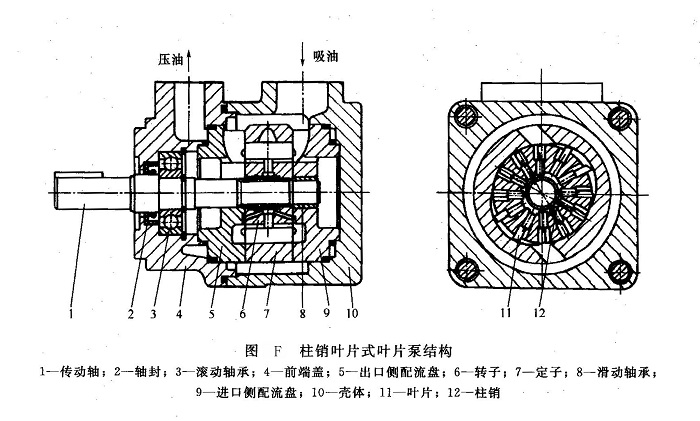 (1)主要結(jié)構(gòu) 葉片泵也屬于殼體承壓型液壓元件,高性能葉片泵的代表性產(chǎn)品有子母葉片式、柱銷葉片式、雙葉片式、階梯葉片式等,其中柱銷葉片式葉片泵的加工工藝最為復(fù)雜,且能包括其他各種泵的加工工藝,故此處以柱銷葉片式葉片泵為主介紹其關(guān)鍵零件的材料及工藝。圖F所示為一種柱銷葉片式葉片泵結(jié)構(gòu),它主要由轉(zhuǎn)子6、定子7、葉片11、兩側(cè)配流盤(pán)5和9、傳動(dòng)軸1及殼體10等關(guān)鍵零件組成。借助由定子內(nèi)表面、轉(zhuǎn)子外表面、裝在轉(zhuǎn)子葉片槽中的兩相鄰葉片和進(jìn)、出口兩側(cè)的配流盤(pán)端面所形成的密閉工作容積的變化,即可實(shí)現(xiàn)吸油和壓油。