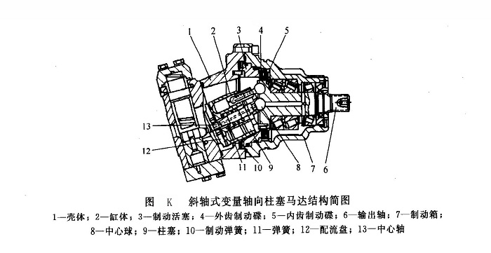 ①功能、結(jié)構(gòu)及故障現(xiàn)象幾臺(tái)小松PC400-3型液壓挖掘機(jī)的行走采用斜軸式軸向柱塞變量馬達(dá)驅(qū)動(dòng)。圖K為該馬達(dá)的結(jié)構(gòu)簡(jiǎn)圖,它由殼體1、缸體2、柱塞9、配流盤12、中心軸13、輸出軸6,以及停車制動(dòng)器(含制動(dòng)箱7,制動(dòng)活塞3,內(nèi)、外齒制動(dòng)碟5、4和制動(dòng)彈簧10等)組成。制動(dòng)器為彈簧上閘制動(dòng),液壓松閘結(jié)構(gòu),即當(dāng)機(jī)器不行走時(shí),馬達(dá)提供壓力油,始終在制動(dòng)彈簧10的彈力作用下處于上閘制動(dòng)狀態(tài);機(jī)器行走時(shí),進(jìn)入馬達(dá)的高壓油推動(dòng)制動(dòng)活塞3,松開制動(dòng)器,馬達(dá)制動(dòng)解除。