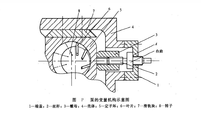 由于原技術文件中無該液壓裝置的系統(tǒng)原理圖,故經仔細分析推斷認為,該液壓變速器實質是一個變量泵和變量馬達組成的閉式容積調速系統(tǒng),根據推斷試探性繪出液壓原理圖(圖O)。該變速器驅動功率(即電動機輸入功率)為5kW,其整體尺寸(含油箱)長×寬×高=600mm×200mm×700mm。液壓泵和液壓馬達的變量調節(jié)機構采用絲桿一螺母組成的螺旋副,并分別通過手輪和鏈傳動進行手動和自動調節(jié);調壓部分采用6片碟形彈簧組;變速器輸入端與動力源采用柔性連接(液壓泵與驅動電動機通過兩根V帶傳動)。