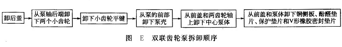 ⑤拆卸液壓泵時(shí),先用專用工具取下8個(gè)螺栓,再用木棒敲擊轉(zhuǎn)動(dòng)軸軸頭,便可分解齒輪泵。注意撞擊主動(dòng)軸時(shí)不要用力過大,輕輕敲擊,多敲幾次。拆卸順序如圖E所示。